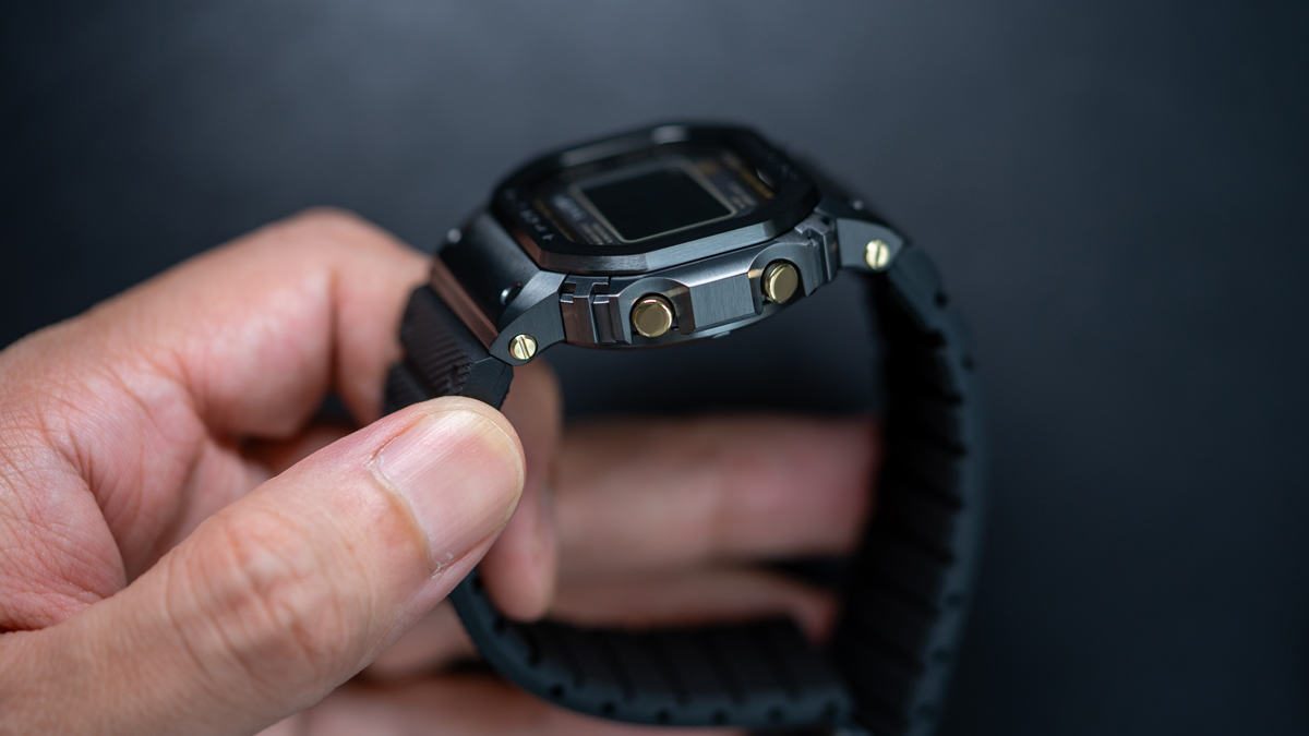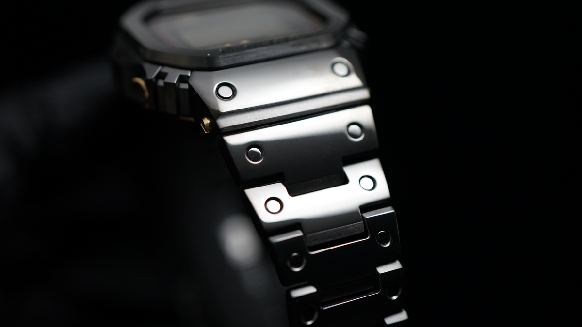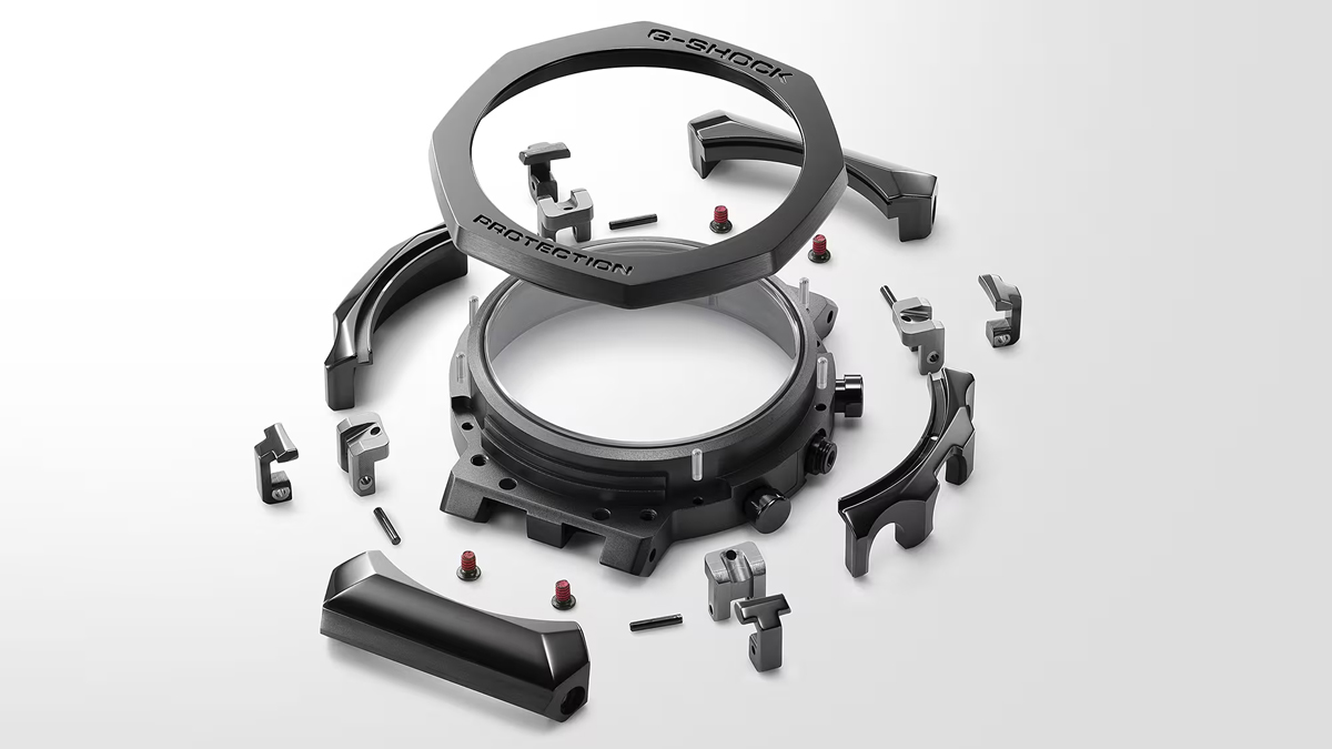 本作では、樹脂で作られたカシオークの複雑な構造を、加工の難しいチタン素材で再現しています。これは、パーツを細かく分解、研磨してから、防水性、耐衝撃性を確保しつつ組み上げる「マルチガードストラクチャー構造」によるもの。これにより、G-SHOCKらしいタフネスを維持しつつ、高級腕時計さながらの美観を実現しているのです。