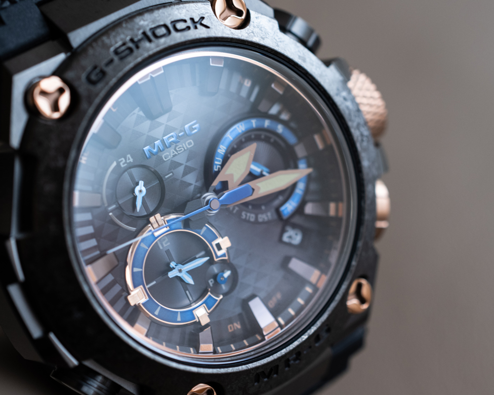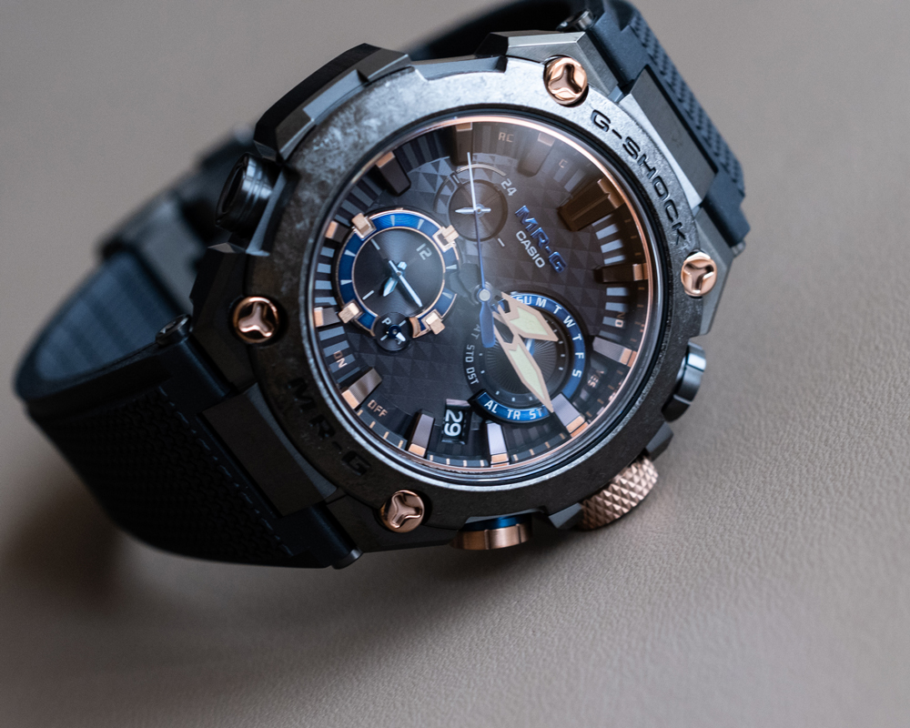加えて、Bluetooth連携によるモバイルリンク機能や、各地域の標準電波受信に対応した電波時計機能を搭載。当然ながら、20気圧防水や耐衝撃性なども備えており、実用性と高級感を兼ね備えたMR-Gの代表格といえるでしょう。