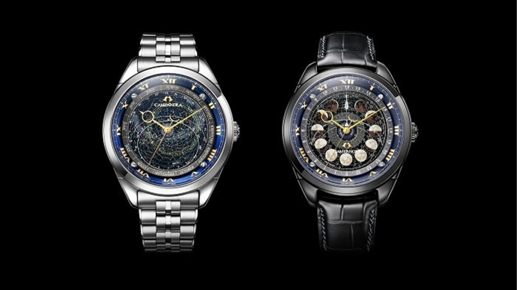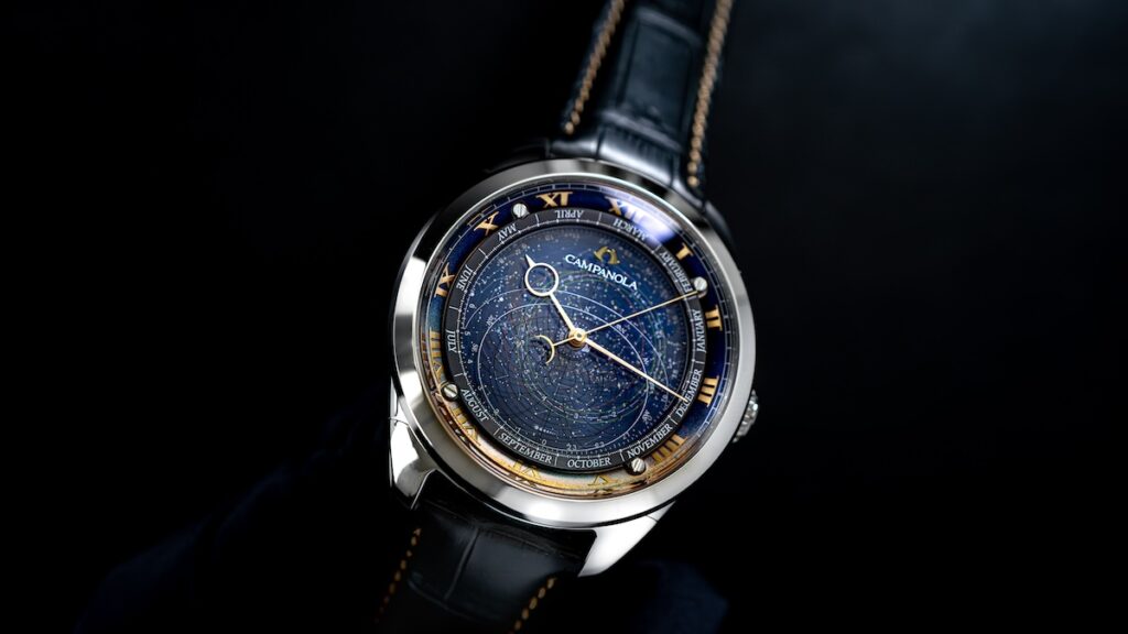 「宙空の美」をデザインコンセプトに、工芸的な美しさと複雑機構を融合させたカンパノラ。象徴的な「コスモサイン」シリーズは、北緯35度の空に輝く実視等級4.8等以上の恒星1,027個、星雲・星団166個を、14版もの精密な印刷を重ねて文字板に再現しています。時刻に合わせて星座盤がリアルタイムで回転し、腕元に現在の星座を正確に映し出す様は圧巻です。