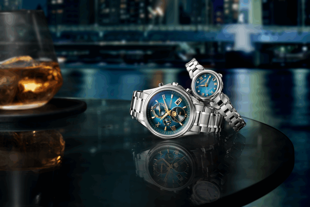 黄昏の景色に蛍が舞う幻想的な情景「蛍火の夜」をテーマにした、世界限定各450本の特別なペアウォッチが登場しました。メンズモデル「BY1020-61W」とレディスモデル「ES9470-68W」は、富士フイルム製の構造色インクとグリーンのグラデーションを組み合わせることで、夜の帳が下りる空の色の移ろいを文字板上に表現。光の当たり方で表情を変える透明感のあるブルーが、見る人を魅了します。