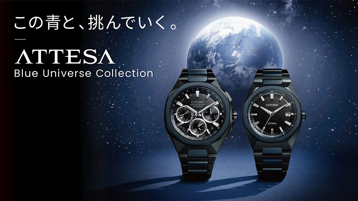 壮大な宇宙をデザインテーマにしたアテッサの限定コレクション「ブルーユニバース」。その新作として、ラグスポチックなフォルムに、ラメ配合の深いブルーのダイアルを持つモデルが登場しました。このコレクションのキーとなるのが、シチズン独自の表面硬化技術「デュラテクトDLCブルー」。キズに強いだけでなく、特殊な薄膜干渉によって、まるで宇宙のような深みのある青色を実現しています。