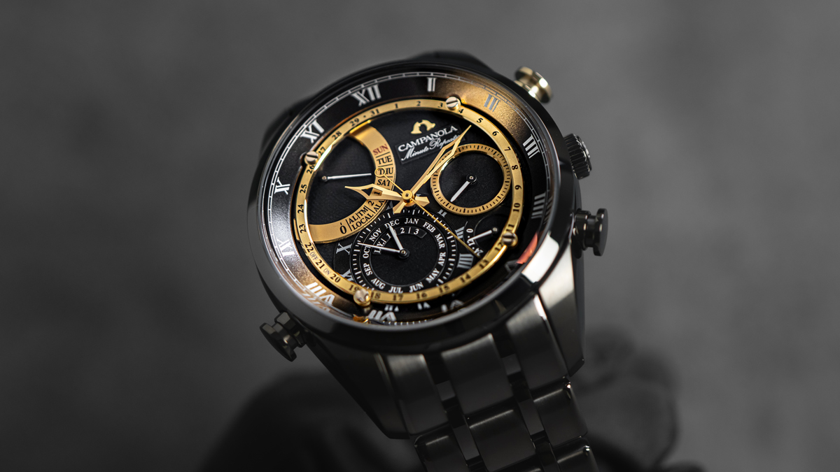 天体の運行や音による時報、暦の管理、時間計測という異なる複雑機構を統合し、感性に訴えかける情緒性と日常に寄り添う実用性を高い次元で両立した1本です。