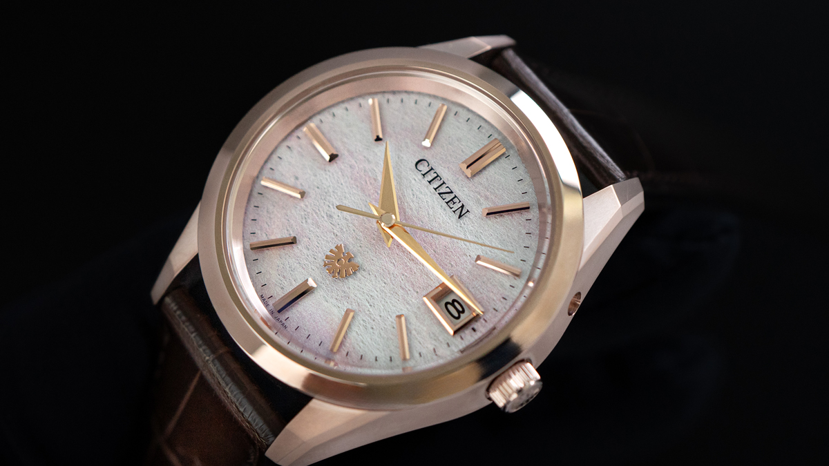 文字板には過去のザ・シチズンでも人気を博した「砂子蒔き(すなごまき)」と呼ばれる伝統的な技法が用いられ、職人の手作業によってプラチナ箔が雪のように散らされています。さらに、その上にはグレーのグラデーションを「にじみ」として重ねることで、厳しくも美しい冬の情景が切り取られました。