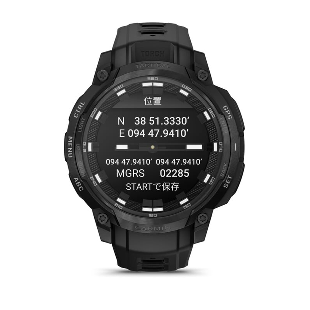 限られた装備の中で、紙の地図とコンパス、そして時計に表示される正確な座標は、何よりも重要な要素となります。その点で言うとインスティンクトシリーズは、一般的な緯度経度に加え、MGRS(軍用グリッド参照システム)座標を含む「デュアルグリッド」表示に対応しており、確実なサポートを可能とします。