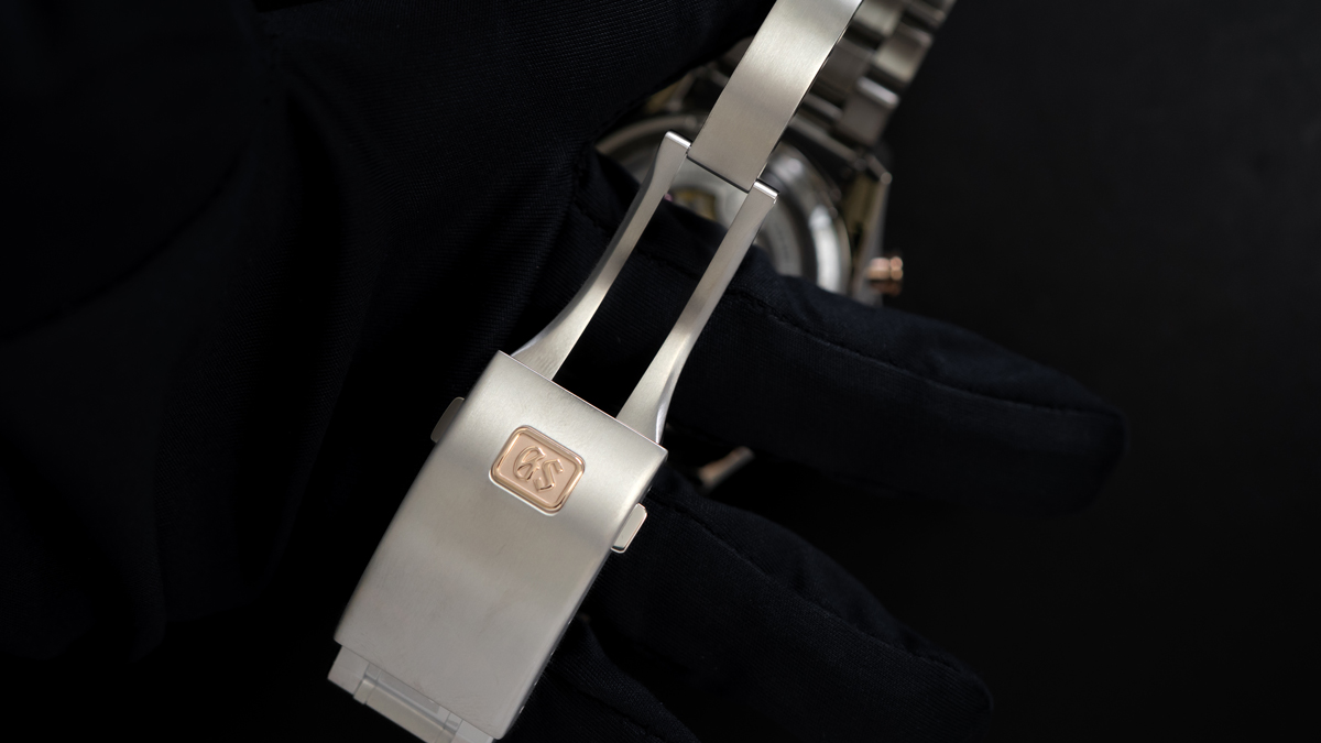バックルはワンプッシュ三つ折れ方式で、その中央には18Kローズゴールド製の「GS」メダリオンがあしらわれています。細部までエレガントさの演出にこだわった、特別なテンタグラフモデルと言えるでしょう。