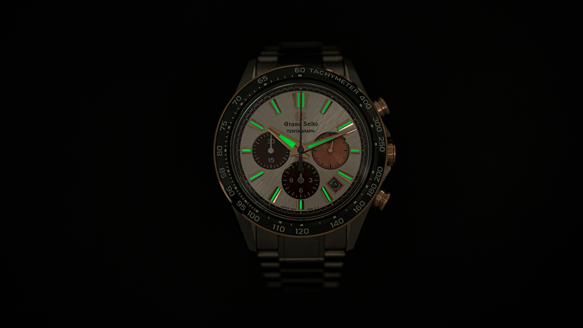 加えて、針とインデックスにもローズゴールドメッキが施され、多角カットにより光の反射で高い視認性を確保しています。その他、情報量の多さを凝縮したクロノグラフフェイスや、針とインデックスの要所にはルミブライトを施すなど、テンタグラフの特徴は従来モデルからそのまま引き継がれています。