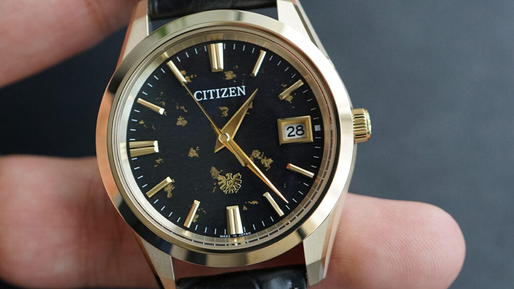 本作の黒和紙文字板は、光をエネルギーにして駆動する「エコ・ドライブ」と相性が悪く、金箔を使いすぎると十分な充電ができません。そこでシチズンは金箔の量を地道に調整し続け、絶妙なバランスを追求。この世界に2つとない文字板を作り上げました。もちろん、この文字板ではエコ・ドライブにしっかりと光を供給できるようになっており、電池交換の必要がありません