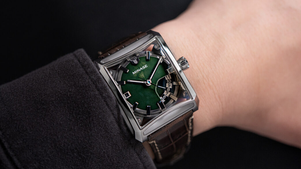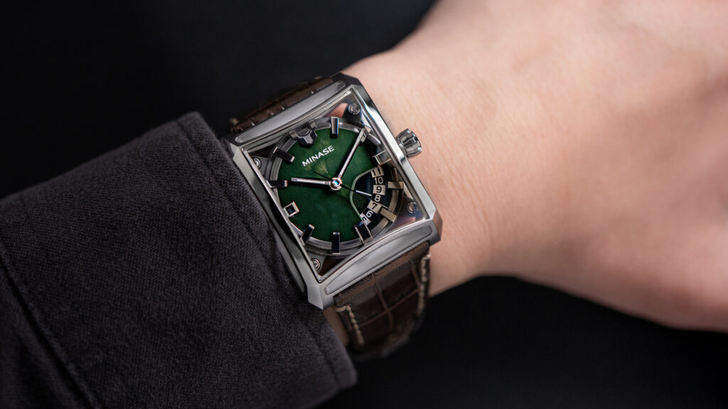 ケースは長方形で、合計7枚のサファイアガラスを備えた独自構造。加えてインナーケースに収められたムーブメントや立体的な文字盤、インデックスが浮かぶように見える「ケース イン ケース」構造は、ミナセならではの美学を象徴しています。