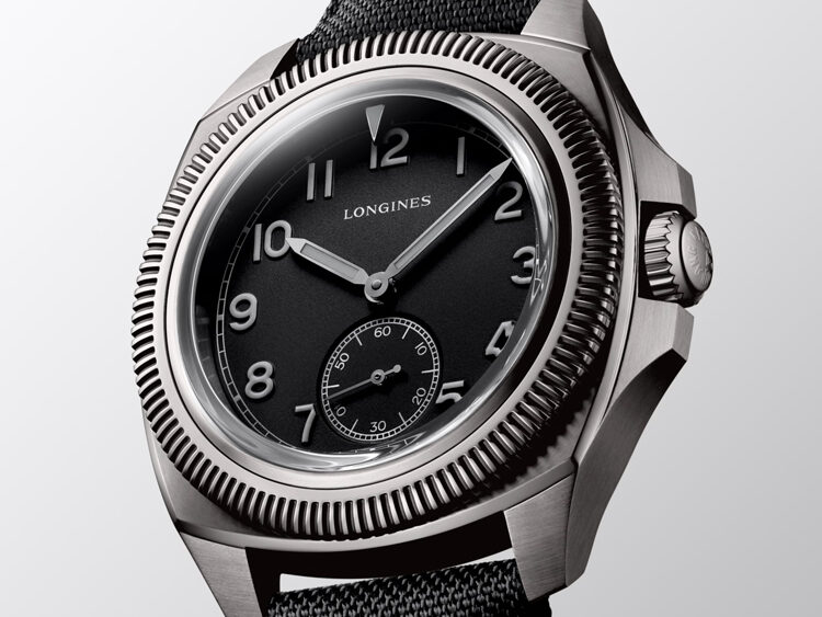マットブラックダイアルにシンプルな針とアラビア数字を配置し、飛行中でも素早く時刻を読み取れる視認性を確保。6時位置にはスモールセコンドを配置し、ダイアルのバランスを整えながら、時間経過を正確に把握できる構成です。