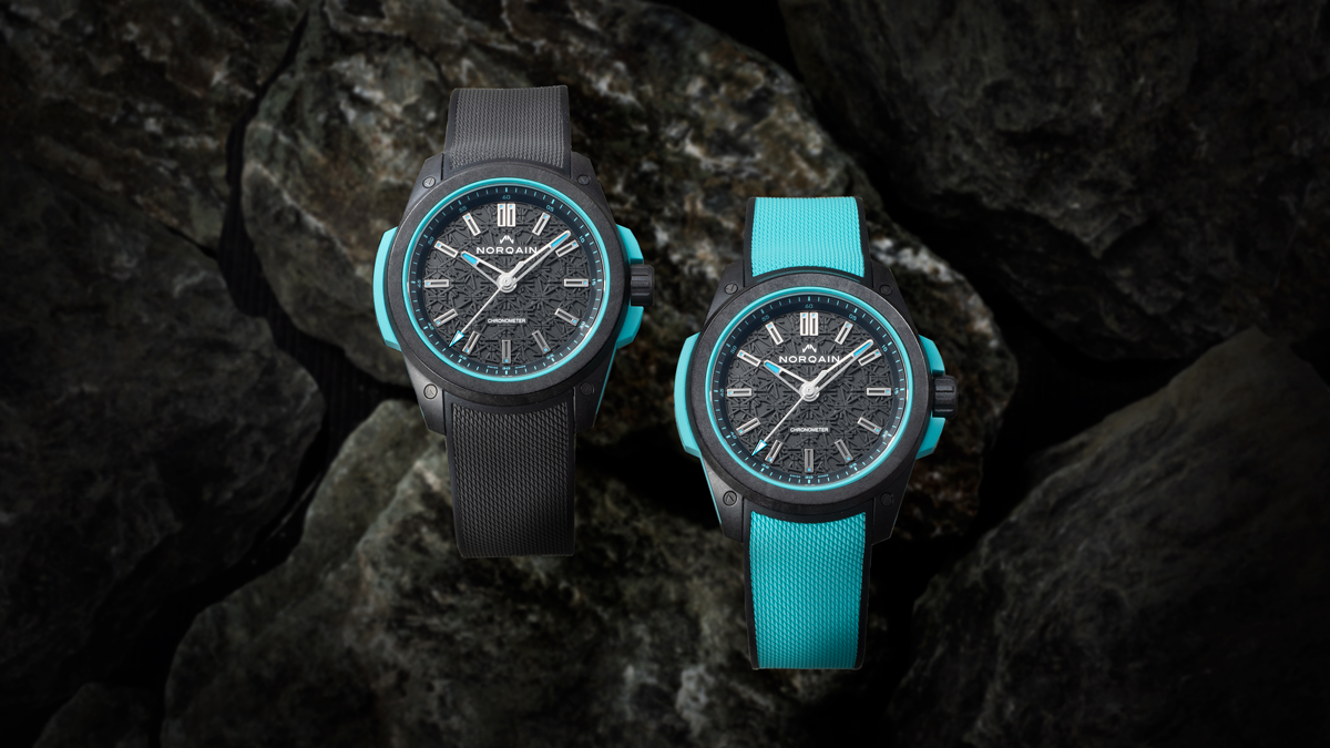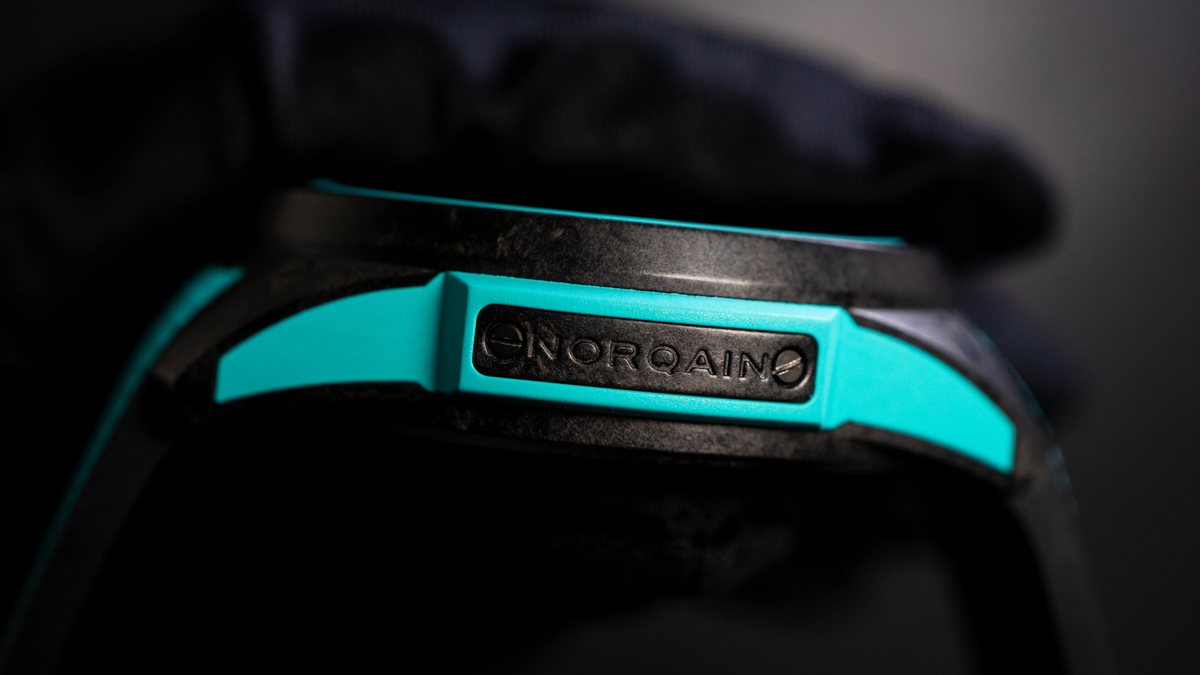 ケース素材に採用されているNORTEQ®(ノルテック)は、豊かな彩色表現を特徴とする、軽量なカーボン複合素材です。今回のターコイズのようなアクセントカラーの配色が可能ており、さらにその重量は、ステンレススティールの約6分の1という軽さを誇ります。