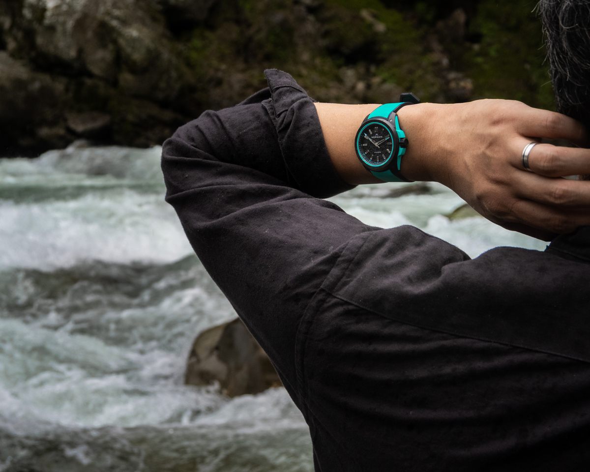 ブレスレットには、ラバーストラップが採用されており、渓谷の力強い流れを彷彿とさせるターコイズと、荘厳な岩肌をイメージしたダークグレーの2本が標準で付属します。シックなダークグレーから、ターコイズのラバーストラップに交換すれば、手元で強い存在感を放つ、異なる表情を楽しむことができます。