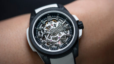 ケースには、ノルケイン独自のカーボン複合素材「NORTEQ」を採用。軽量でありながら高い耐久性を誇り、5000Gの耐衝撃性能を有しています。加えて内部にはラバーショックアブソーバーを組み込み、軽やかさと耐久性を実現した、スケルトンモデルを実現しているのです。