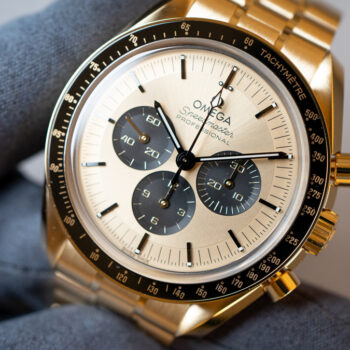 18Kムーンシャインゴールド製のケースは磨き上げられており、その輝きはまさに月のよう。基本的な造形は通常のスピードマスターと同様であり、その42mmのサイズ感も存在感があります。