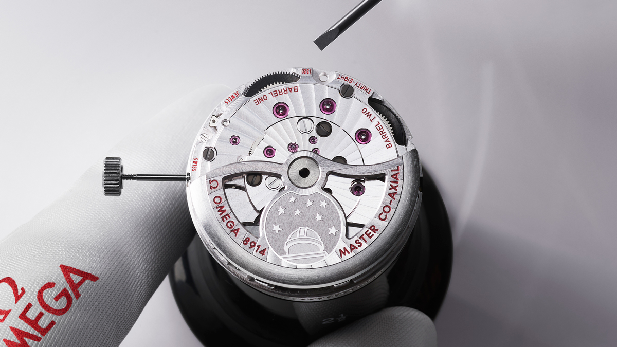 一方、O-MEGAスティールモデルには、キャリバー8914を搭載。基本構造は8915を踏襲しつつ、ロジウム仕上げによる落ち着いた美観を有しています。