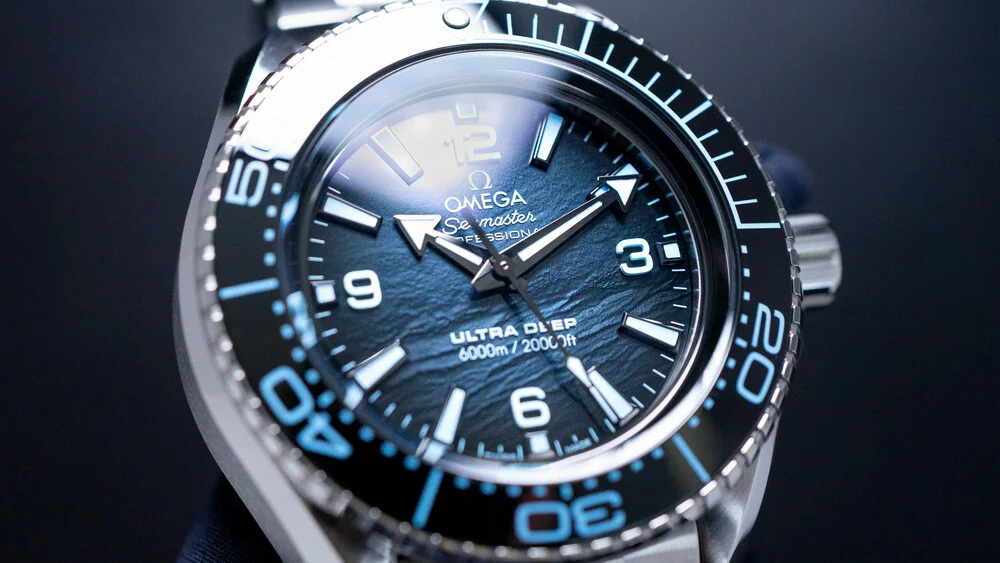 計7本のシーマスターが展開されるサマーブルーシリーズでは、それぞれの防水性に合わせた色合いのダイアルを特徴としています。その中でも6000m防水を誇る本作では、世界で最も深いチャレンジャー海淵の地形が肉厚の塗装によって、神秘的に表現されています。さらに、UVライトを当てることで浮かび上がる隠れた演出など、語れるディテールの多さも魅力です。