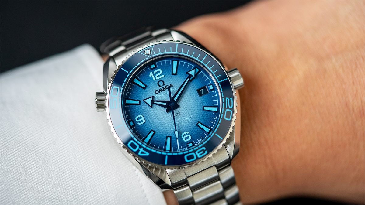 ダイアルには、オメガ独自のサマーブルーカラーと縦方向のヘアライン加工を採用。PVD加工で仕上げられた光沢あるグラデーションが、夏の海を思わせる繊細で鮮やかな青を描き出しています。