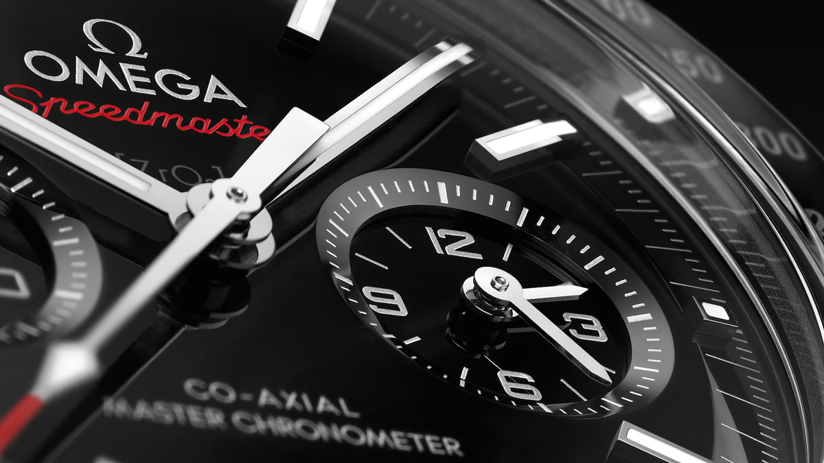 さらに、クロノグラフ秒針の先端やダイアルの「Speedmaster」ロゴにのみ印象的な赤のアクセントをあしらうことで、スポーティな王道のクロノグラフであることを力強く主張しています。