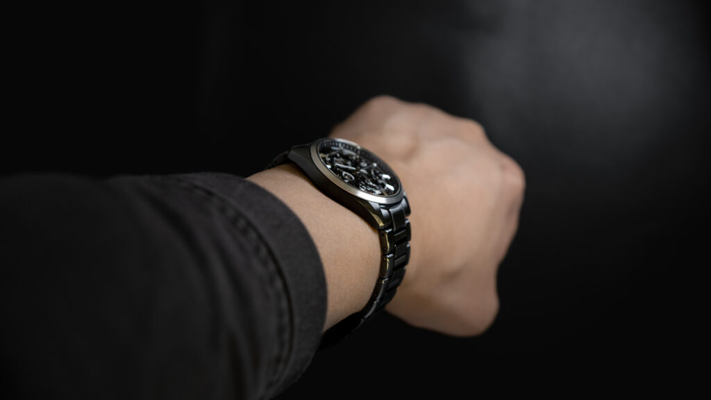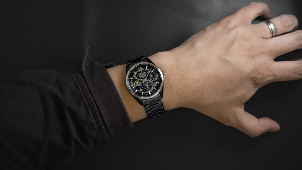 ブラックを基調としたカラーリングと、スケルトン構造によって露わになる精緻な内部機構が重なり合い、立体的で奥深い表情を生み出しています。その魅力を詳しく見ていきましょう。