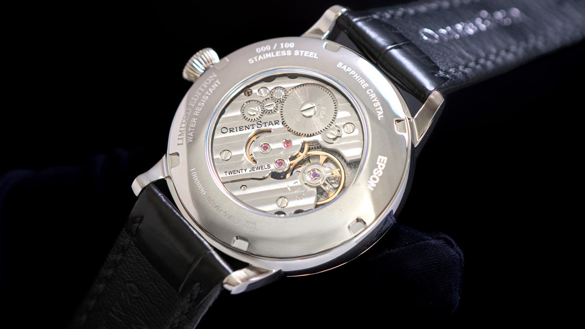 なお、裏蓋はシースルーバック仕様となっており、搭載ムーブメントの精緻な動きを鑑賞できるようになっています。加えてここには、100本限定であることを示すシリアルナンバーが見られます。