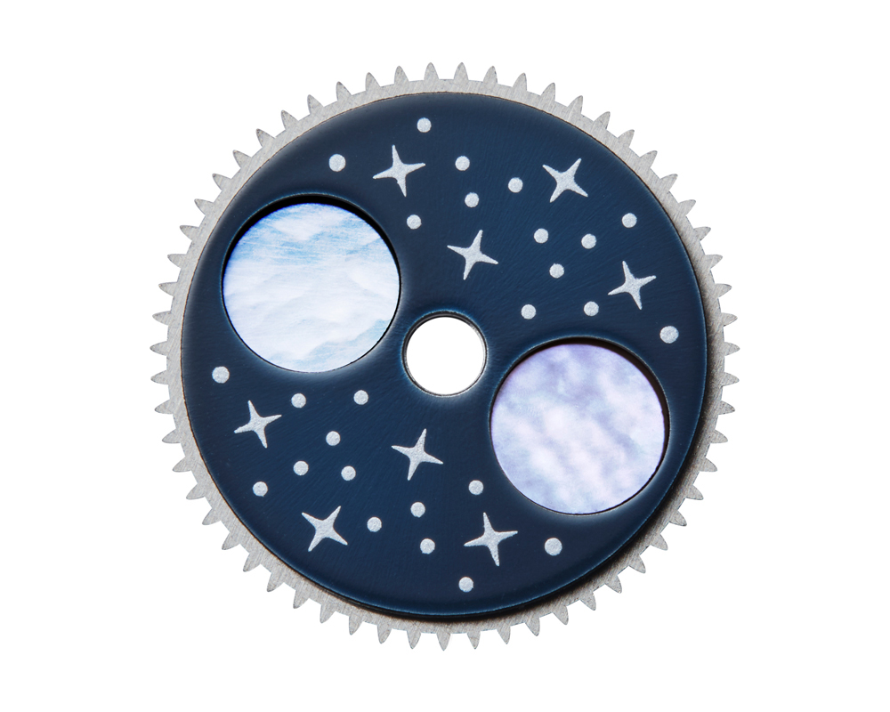 そして、本作の目玉となる6時位置のムーンフェイズのディスクは従来から構造が改められ、月のモチーフにはエレガントな白蝶貝が用いられています。星をちりばめた艶やかな夜空の金属板と、白蝶貝のやわらかな輝きの月が美しいコントラストを見せ、盤面に神秘的でロマンチックなニュアンスを添えています。