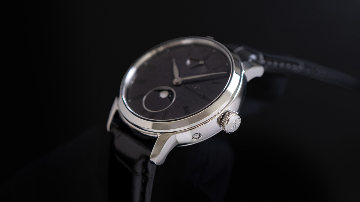 手巻き式ムーブメントの精緻な鼓動を聴きながら、リューズを巻くという能動的な行為を通じて、ムーンフェイズの詩情とロマンをより深く体感することができるのです。便利さでは自動巻きに譲るかもしれませんが、それだけ手をかける価値のあるモデルと言えるでしょう。
