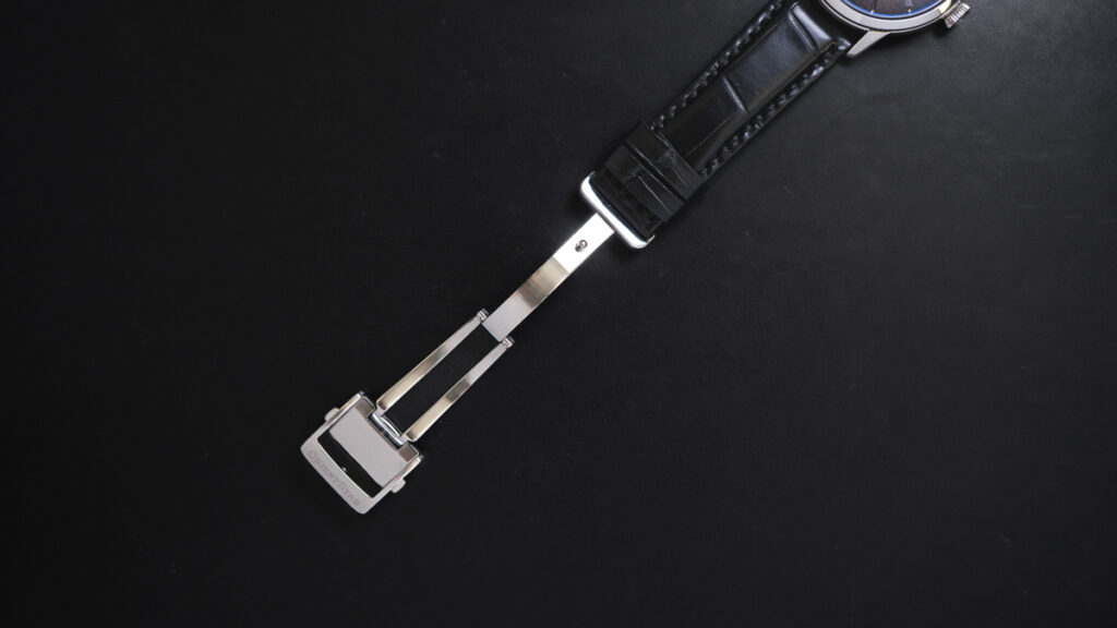 さらに特筆すべきは、コードバン(馬革)の替えストラップが付属している点です。ツヤのあるコードバンストラップに付け替えることで、また異なる印象を楽しむことができるでしょう。中留は、プッシュ三つ折式です。