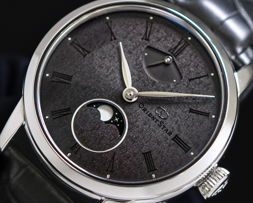 12時位置には、オリエントスターのトレードマークであるパワーリザーブインジケーターを配置。手巻き式時計にとって役立つ巻き上げ残量を表示します。