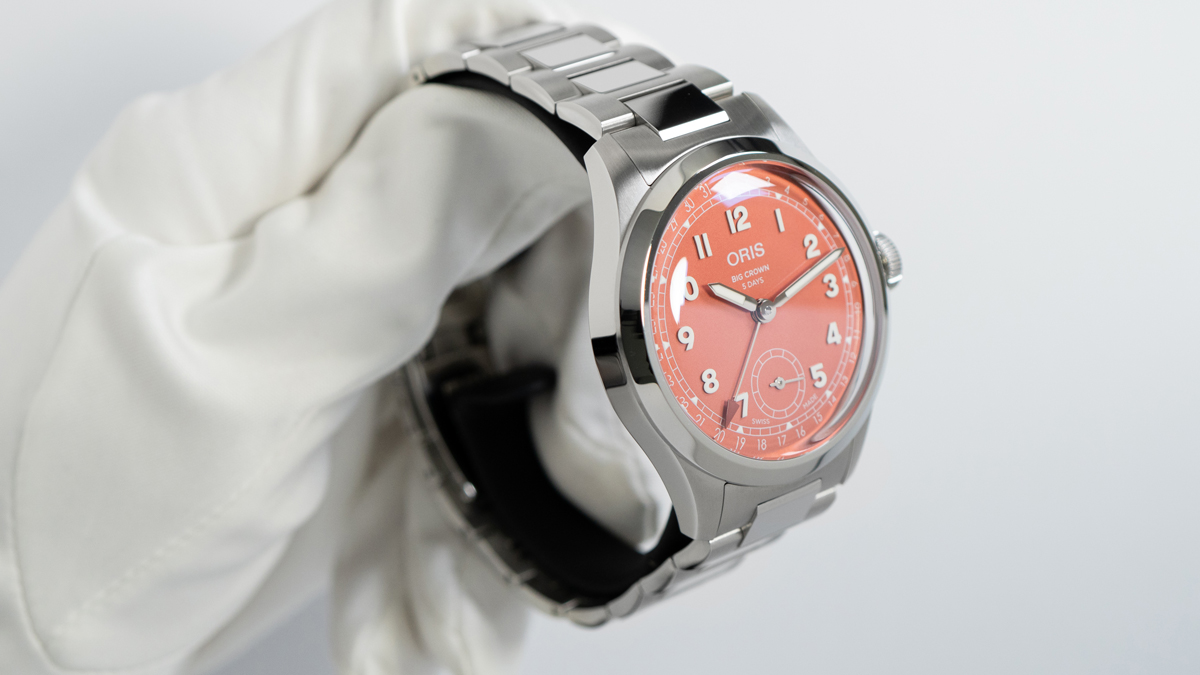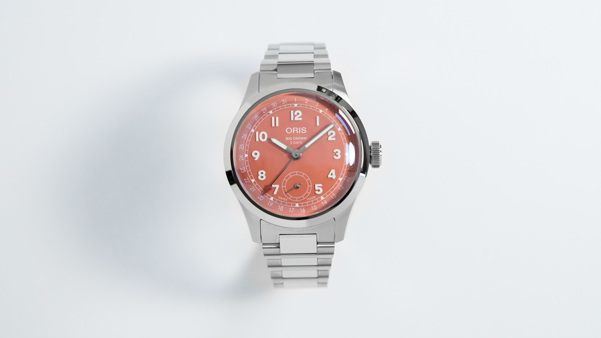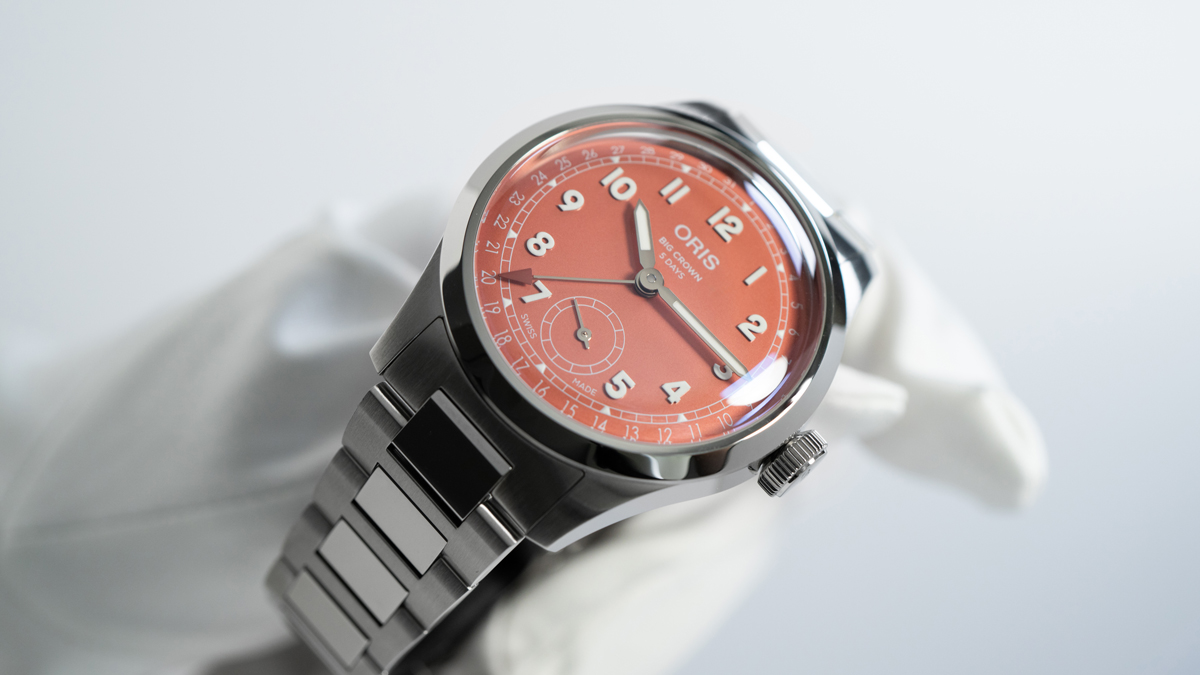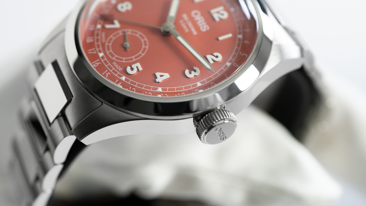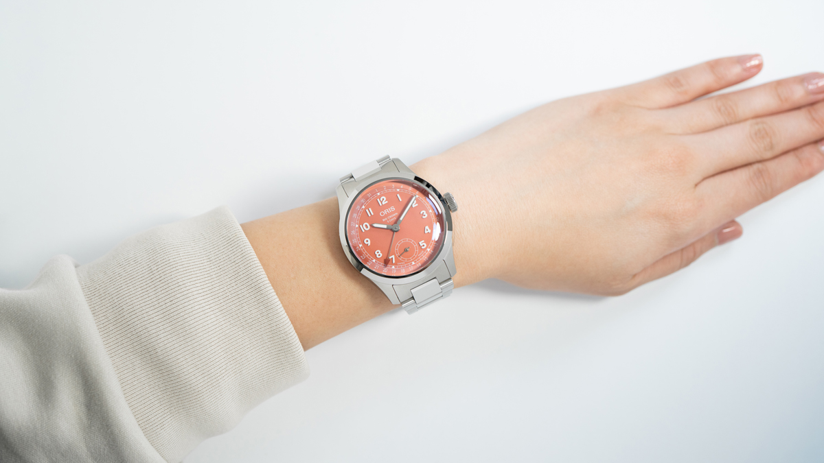 本作は、オリスが長年培ってきた伝統と現代的な感性が融合した一本です。温かみのあるテラコッタレッドのダイアルは個性を放ちながらも上品で、クラシカルなデザインと高い実用性を両立しています。