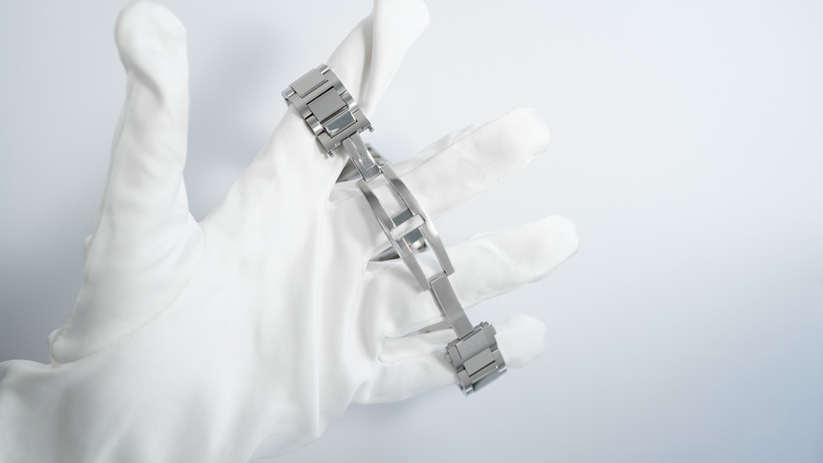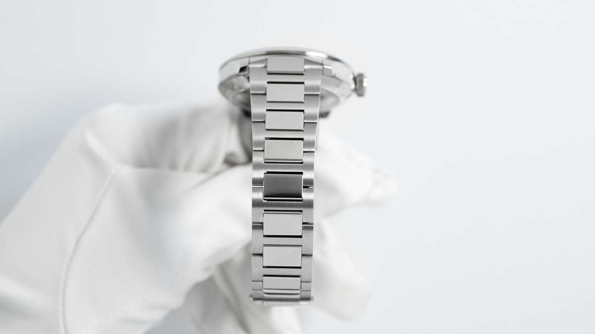 ブレスレットには、ケースと同様に堅牢なステンレススチールが採用されています。2025年の刷新からH型のコマが使用されるようになり、スポーティな印象が与えられました。また、ヘアライン加工と鏡面仕上げの異なる質感が織りなすコントラストが、絶妙な高級感を演出しています。