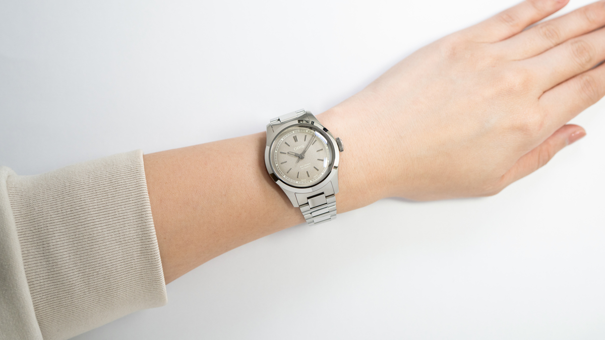 ダイアル外周にはレイルウェイトラックを配し、アラビア数字インデックスとポインターデイト機構を組み合わせることで、オリスらしい個性を演出。ワントーン系統のカラーリングによってツールウォッチ感も抑えられており、女性の手にも馴染みやすいでしょう。