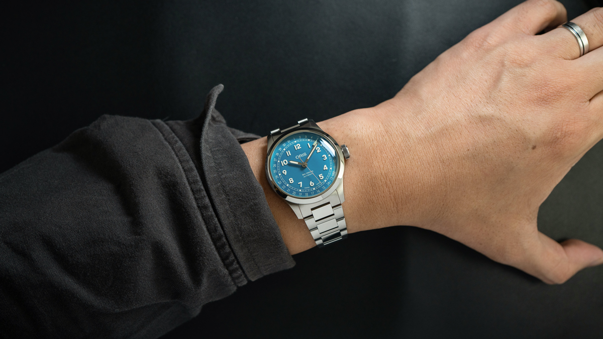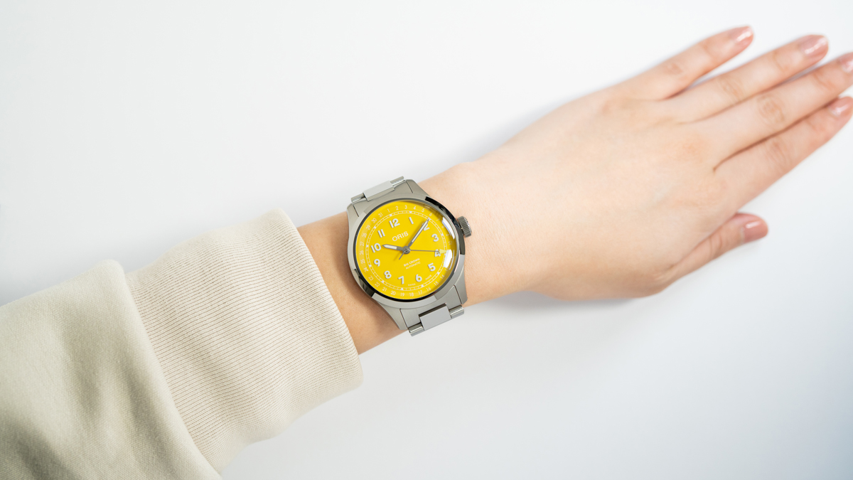 ケースには鏡面とヘアラインを組み合わせたステンレススチールを採用し、上質な輝きと堅牢さを両立。Hリンクブレスレットはオリス独自の人間工学的両開きクラスプを備え、快適な装着感を実現しています。