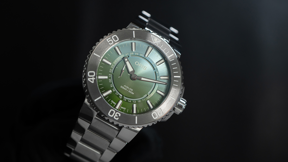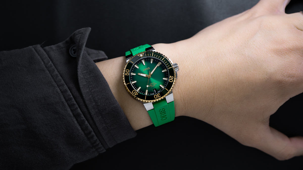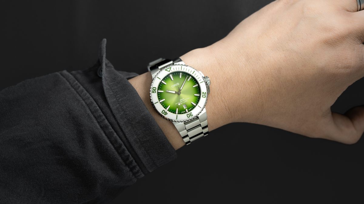 オリスが2024年のサマーシーズンにリリースした、爽やかな表情のアクイス デイトです。ホワイトセラミックスを用いたベゼルと、鮮やかなサンレイグリーンダイアルを組み合わせ、カジュアルシーンに抜群に馴染む1本に仕上がっています。