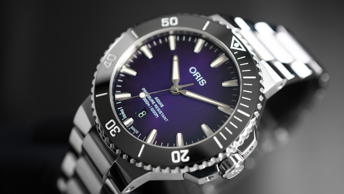 本作は、オリスの本拠地であるヴァルデンブルク渓谷の真夏の夜に漂う薄暮の光を映したような、幻想的なパープルダイアルが印象的です。サンレイ仕上げによって光の角度でニュアンスが変化し、深みのある色彩が腕元に豊かな表情を与えます。