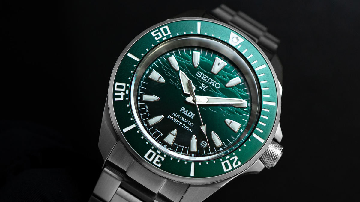 水中から見上げた情景を映したエメラルドグリーンのグラデーションダイアルが特徴で、降り注ぐ光や水面の揺らめきを閉じ込めたような表情は、深海の静けさと神秘性を感じさせながら腕元に爽やかな印象を添えます。