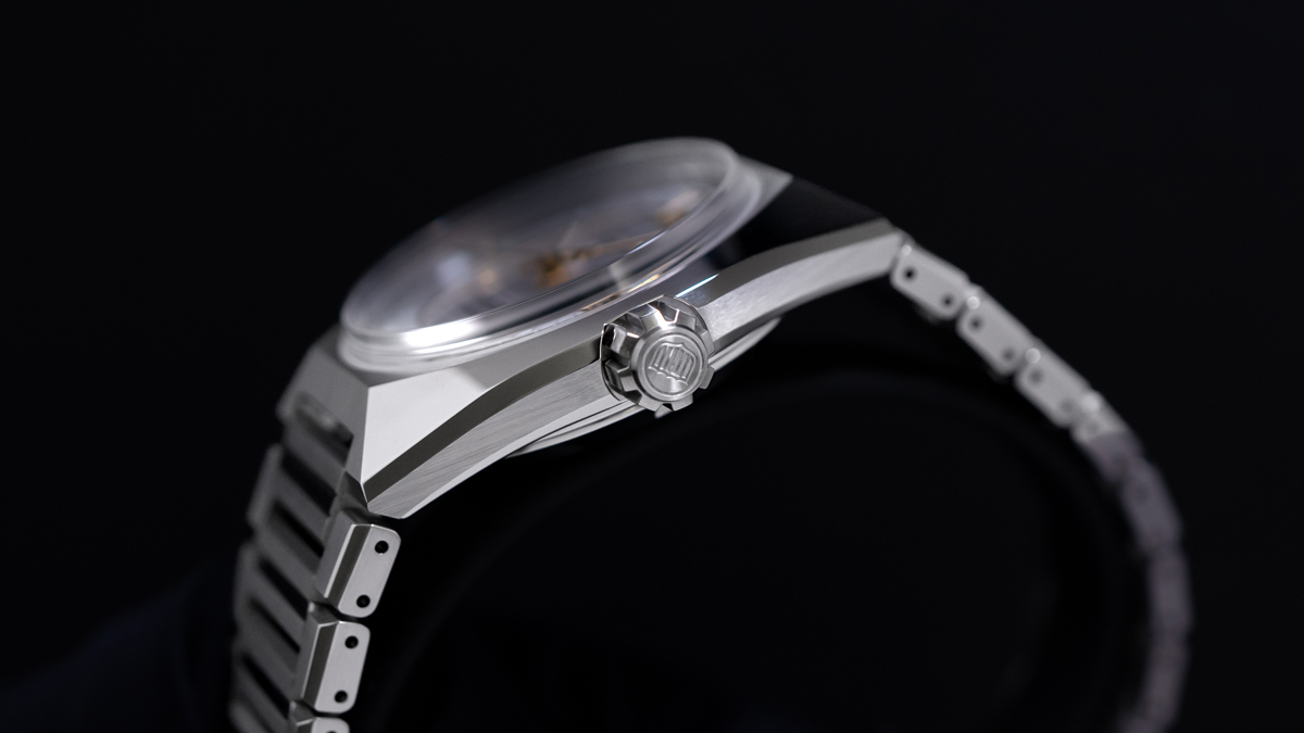 ケースデザインは、力強くも洗練された印象を与えます。金属の塊から削り出したような、シャープで力強い多面体構成のフォルムは、オリジナルのVANACが持っていた斬新さを色濃く継承したもの。風防には、クラシックな趣と高い視認性を両立するボックス型のサファイアガラスが採用され、その内面には無反射コーティングが施されています。