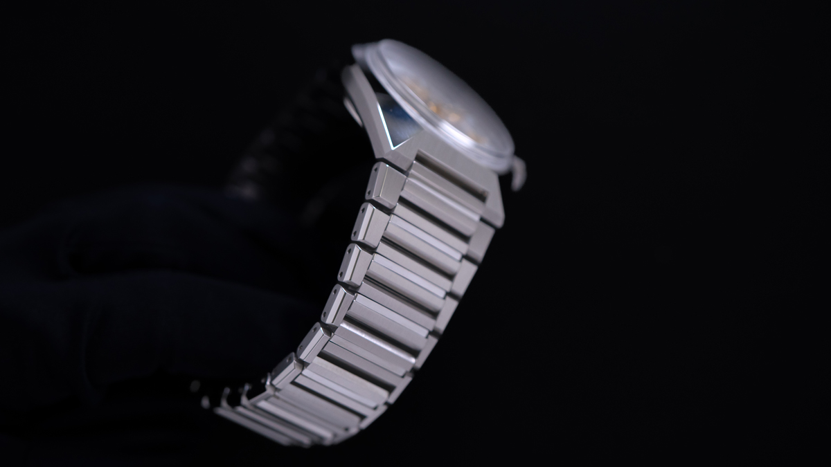 また、その形状はバックルに向かってほとんどテーパーしていないため、ホールド感も文句なし。鏡面とヘアラインの仕上げ分けは見事な仕上がりで、時計全体としての調和を高めています。