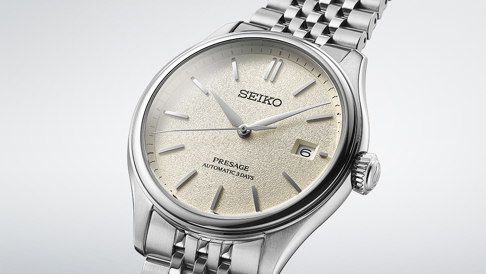 クラシックシリーズは、日本の生活文化に根づいた「用の美」を腕時計へ落とし込んだシリーズです。絹のような型打ち模様を施したカーブダイアルに、緩やかに曲げられた針やインデックスが調和し、落ち着いた雰囲気をつくっています。