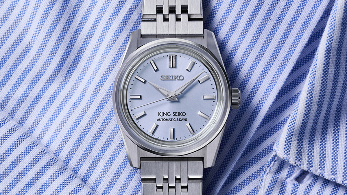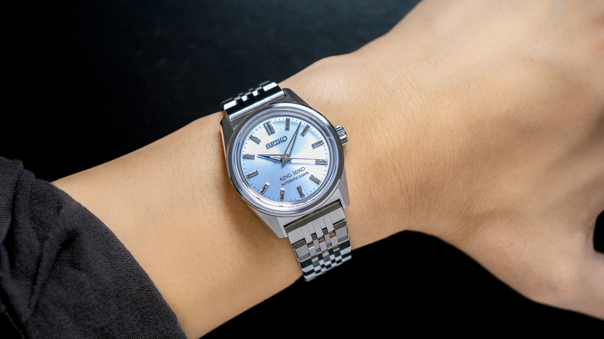 サックスブルーのダイアルはオックスフォードシャツのように爽やかで、サンレイ仕上げが角度によって豊かな表情を生み出します。