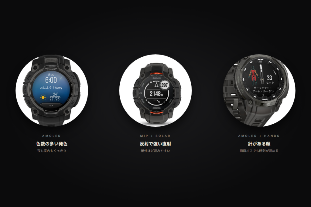 - Instinct 3 AMOLED:Instinctの骨格に、スマホのような発色のAMOLEDを載せた「見やすさ最優先」モデル。品番は45mmが