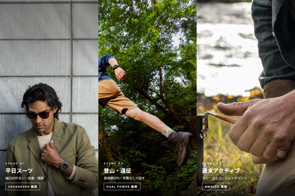 既にGarminのMIPモデルやfenix系をお使いで、2本目・買い替えを検討している方には、Instinct Crossover AMOLED チャコールグレー(010-03398-30)をおすすめしたい。これまでのGarmin体験に「針のある時計」という新しい軸が加わります。スーツとの相性を含め、ワードローブの中での使いどころが広がる1本です。