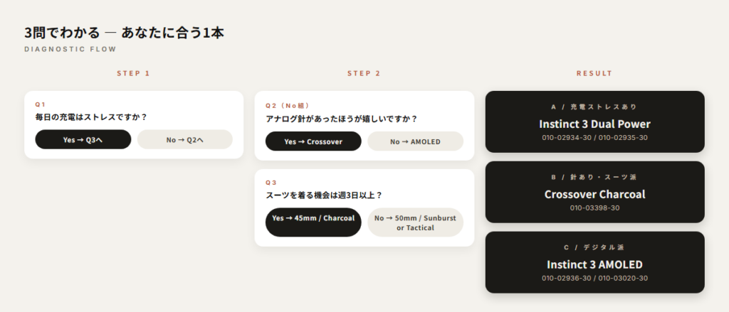 - No(デジタルだけで十分) → Instinct 3 AMOLEDへ。Q3でサイズを決めます。